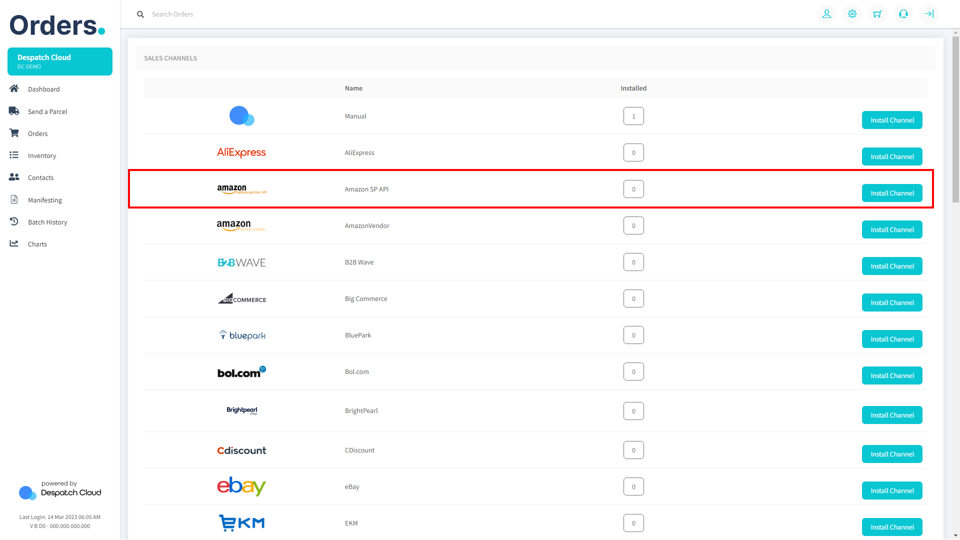 2. Once you are in the Sales Channels section, you will see a list of available integrations. Look for "Amazon SP API" and click the "Install Channel" button next to the Amazon SP API logo to proceed with the installation.