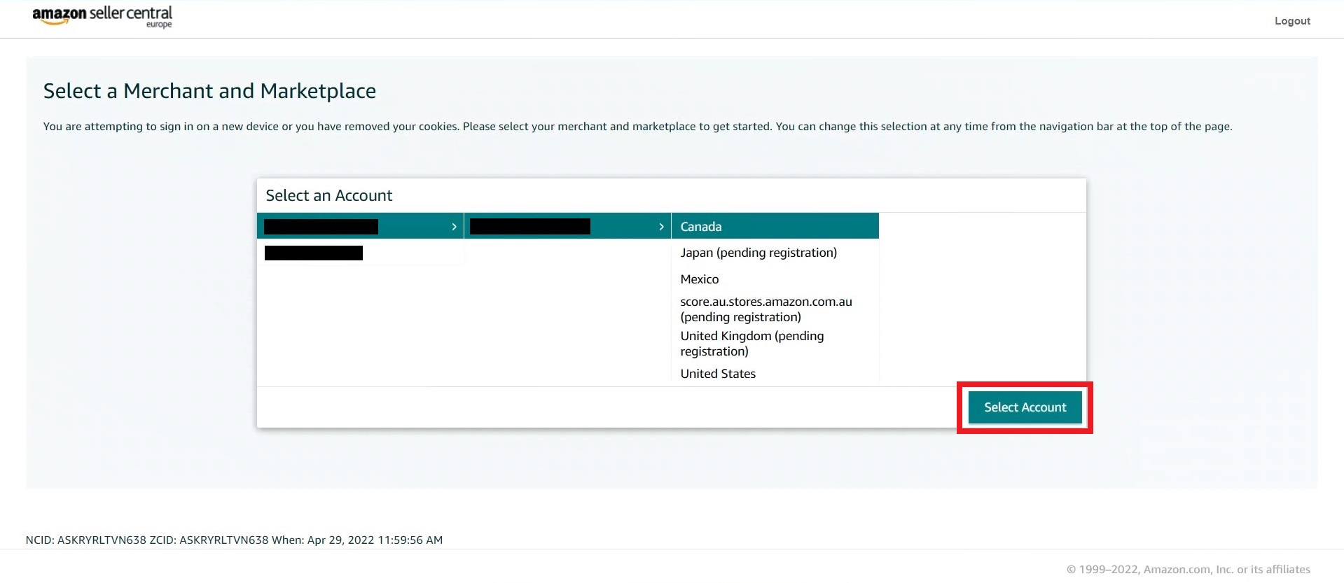 6. On this page, choose your Amazon account and the relevant marketplace, and then click on the "Select Account" button.