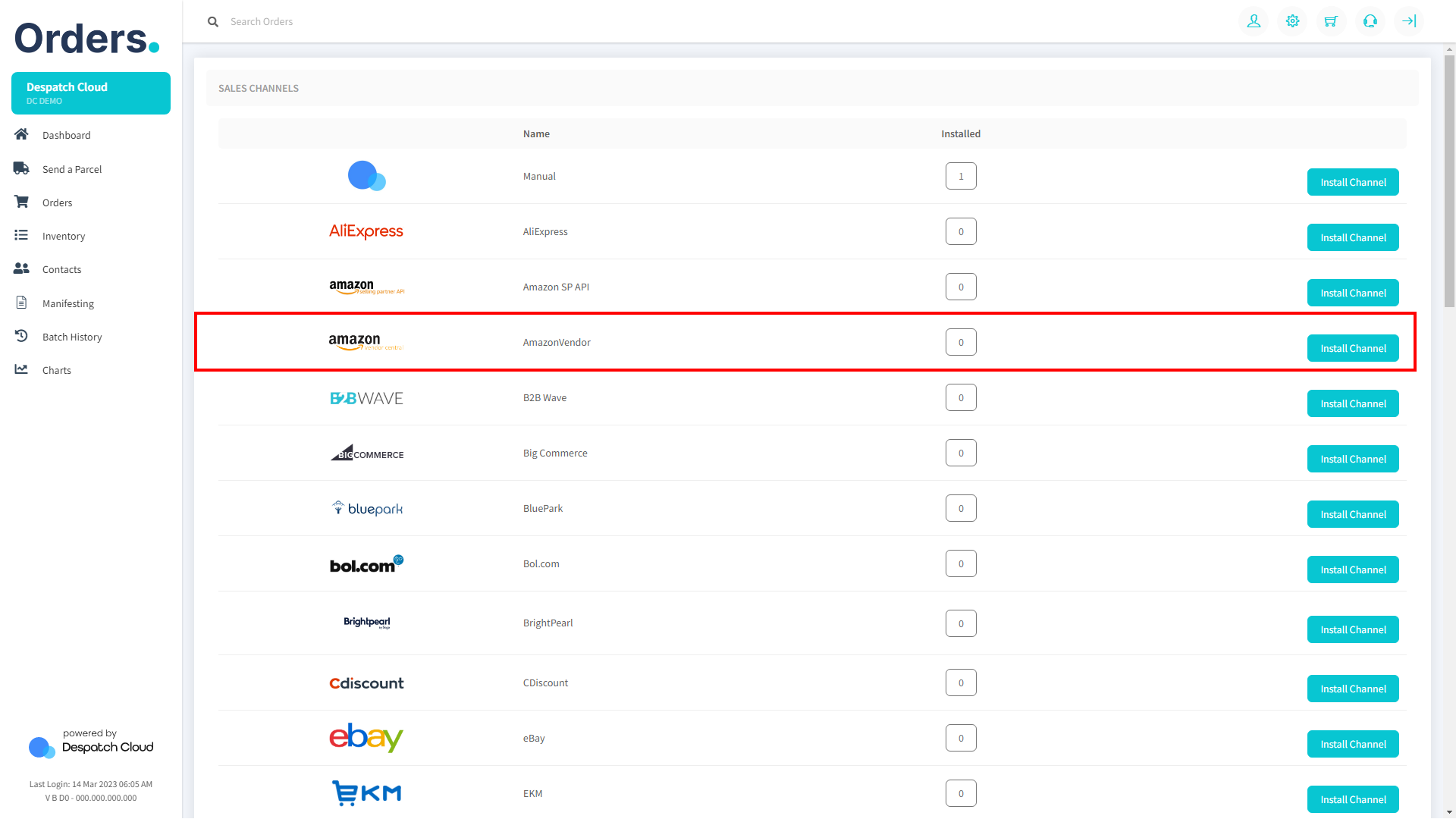2. Once you are in the Sales Channels section, you will see a list of available integrations. Look for "Amazon Vendor Central" and click the "Install Channel" button next to the Amazon Vendor Central logo to proceed with the installation.