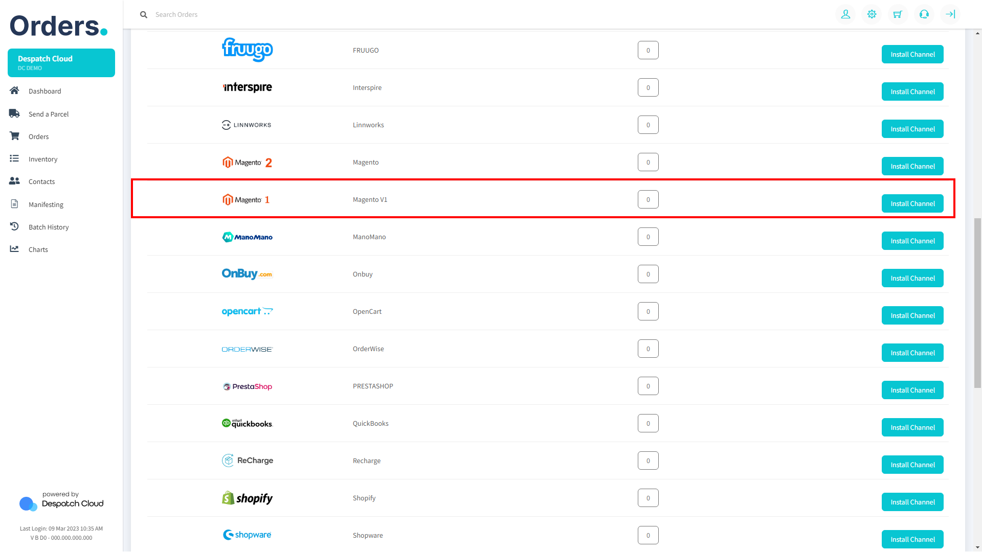 2. Once you are in the Sales Channels section, you will see a list of available integrations. Look for "Magento 1" and click the "Install Channel" button next to the Magento 1 logo to proceed with the installation.