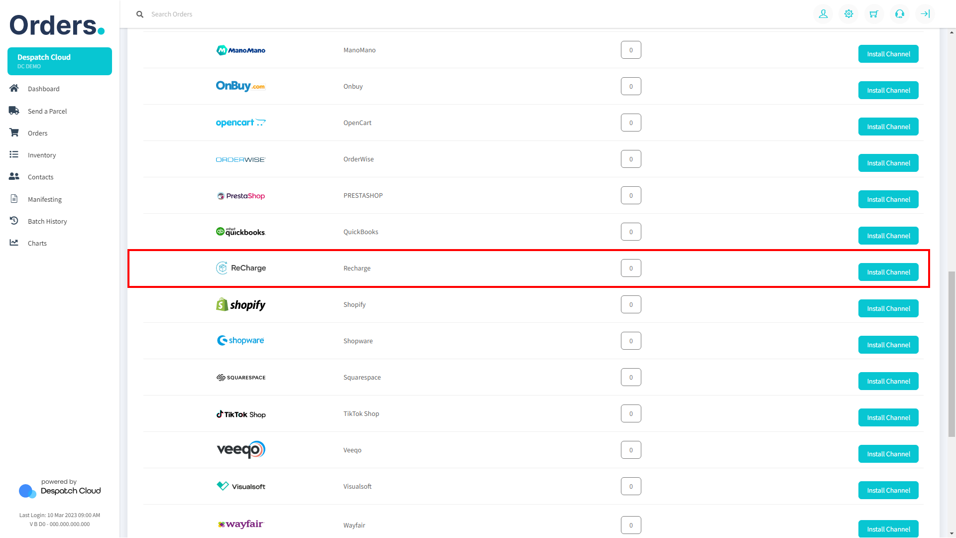 2. Once you are in the Sales Channels section, you will see a list of available integrations. Look for "ReCharge" and click the "Install Channel" button next to the ReCharge logo to proceed with the installation.