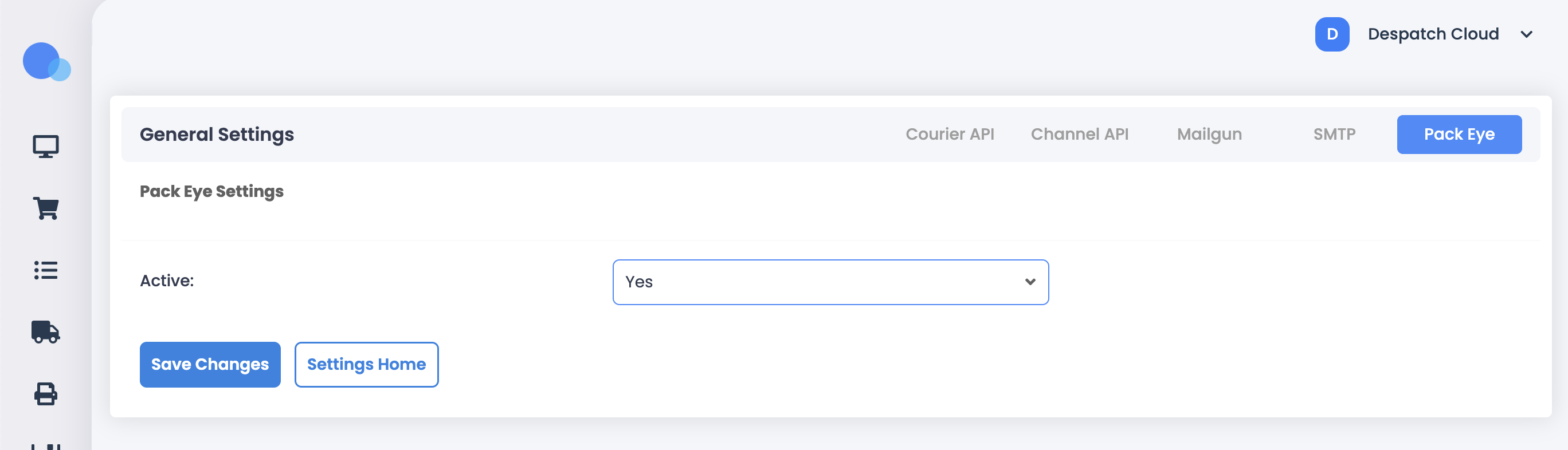 To enable this in Warehousing v3.5 & v3.6, go to Settings > Integrations and view the PackEye tab. Set Active to Yes and press Save Changes.