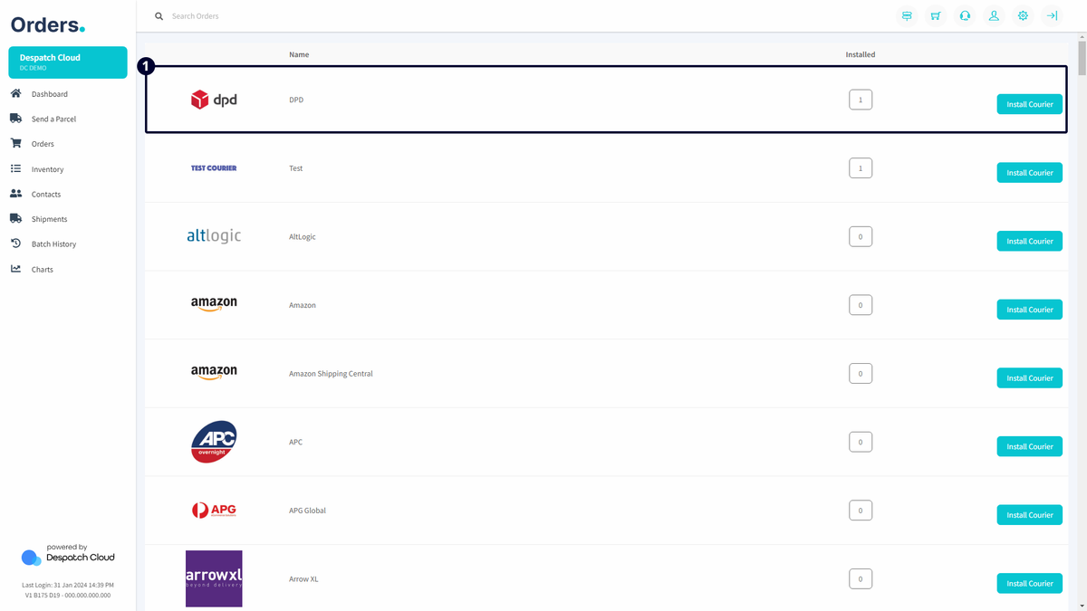 To install a new courier integration, click the "Install Courier" button adjacent to the count. A window will appear with input fields where you'll input the required information for the courier.